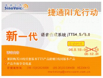 2006年8月18日,捷通華聲正式發(fā)布新一代語(yǔ)音合成系統(tǒng)jTTS4.5,同時(shí)啟動(dòng)了為期三個(gè)月的“陽(yáng)光行動(dòng)”。行動(dòng)一經(jīng)推出,立即引起了強(qiáng)烈的市場(chǎng)反響。每日致電(86-10)82826886咨詢jTTS4.5產(chǎn)品及價(jià)格詳情的客戶接連不斷,通過(guò)訪問(wèn)捷通華聲語(yǔ)音合成在線演示系統(tǒng)http://www.sinovoice.com.cn/2-e-1.asp或者撥打24小時(shí)產(chǎn)品演示熱線(86-10)82826886-8624體驗(yàn)合成效果自然度和流暢度的用戶絡(luò)繹不絕,定購(gòu)產(chǎn)品享受累積購(gòu)買10線任意版本TTS附贈(zèng)2線同版本產(chǎn)品等優(yōu)惠政策的合作伙伴更是紛至沓來(lái)。大家都對(duì)jTTS4.5的新增甜美音色大加贊賞,更對(duì)jTTS4.5合成效果自然度和流暢度的提升給予了極大的肯定及滿意,同時(shí)表達(dá)出希望能延長(zhǎng)活動(dòng)時(shí)間的誠(chéng)懇建議。為答謝新老客戶對(duì)捷通產(chǎn)品的關(guān)注與厚愛,捷通公司特決定將“陽(yáng)光行動(dòng)”活動(dòng)時(shí)間延期至12月31日。