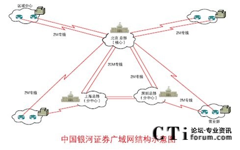 銀河證券采用二級網(wǎng)絡結(jié)構(gòu),其中一級采用三中心的冗余結(jié)構(gòu);二級為各營業(yè)部。營業(yè)部線路上采用雙專線的冗余線路方式,其中兩條線路分別屬于兩家不同的電信運營商。營業(yè)設(shè)備上采用雙設(shè)備,保證了營業(yè)部在設(shè)備上的冗余,避免硬件設(shè)備單點故障,同時實現(xiàn)了業(yè)務網(wǎng)與辦公網(wǎng)的物理分離。