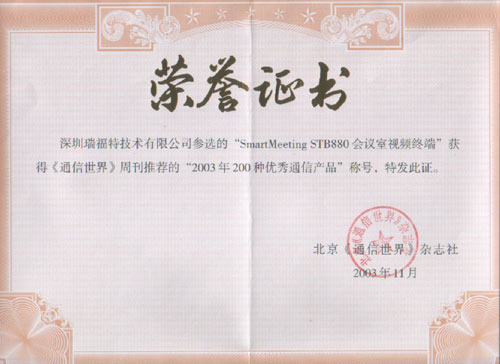 2003年是視頻會議突飛猛進的一年,今年11月由北京《通信世界》雜志社主辦的"2003年200種優(yōu)秀通信產(chǎn)品"評選活動已經(jīng)揭曉,深圳市瑞福特信息技術有限公司的SmartMeeting STB880會議室視頻終端獲得此榮譽稱號。