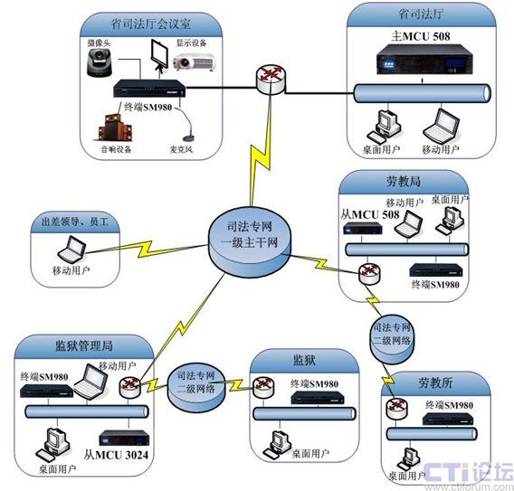 MCU 508),部署在省司法廳信息中心機房;在監(jiān)獄管理局和勞教局各部署1臺從MCU(一臺SM MCU 508+一臺SM