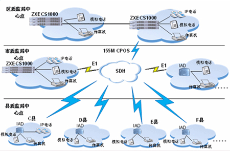 其它各接入節(jié)點采用IAD設備接入到ZXECS 1000,最大程度的降低了語音接入的成本,同時IAD靈活的擴展性利于今后的升級。