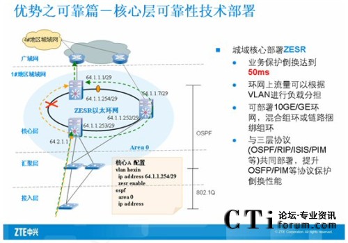 除了選型、分析各網(wǎng)絡(luò)層的設(shè)備以外,還要考慮全網(wǎng)設(shè)備的聯(lián)動(dòng)性,重點(diǎn)突出全網(wǎng)的QOS解決方案。通過(guò)與客戶的交流,發(fā)現(xiàn)客戶之所以建設(shè)這個(gè)網(wǎng)絡(luò),不僅僅是滿足辦公上網(wǎng)需求,更重要的是要保證關(guān)鍵業(yè)務(wù)的可達(dá)性和關(guān)鍵部門的連通性,因此給客戶提供一個(gè)更高的服務(wù)質(zhì)量就顯得更加重要。那么如何保證關(guān)鍵用戶的上網(wǎng)權(quán)益,關(guān)鍵業(yè)務(wù)的時(shí)時(shí)到達(dá),勢(shì)必要求我們的網(wǎng)絡(luò)要建立一整套完善的QOS服務(wù)質(zhì)量。在中興的方案中,無(wú)論是核心層的設(shè)備還是匯聚接入層的設(shè)備,都選擇了高QOS的網(wǎng)絡(luò)產(chǎn)品,能夠?yàn)橛脩籼峁┒说蕉说腝OS保證。從接入層開(kāi)始,根據(jù)用戶的業(yè)務(wù),打上不同的TAG標(biāo)簽,區(qū)分不同的業(yè)務(wù)種類,交換機(jī)可以根據(jù)不同的業(yè)務(wù)種類對(duì)業(yè)務(wù)流量進(jìn)行檢索,對(duì)那些關(guān)鍵業(yè)務(wù)打上高優(yōu)先級(jí)的標(biāo)簽,保證其在整網(wǎng)的優(yōu)先轉(zhuǎn)發(fā)性。在農(nóng)機(jī)院內(nèi)部網(wǎng)絡(luò),從接入到核心、匯聚,都保持了標(biāo)簽的有效性,也就都保持了關(guān)鍵業(yè)務(wù)的優(yōu)先處理性,為武清電力通信數(shù)據(jù)網(wǎng)絡(luò)內(nèi)部提供了高QOS保證。另外為了使客戶更好的理解我們的QOS解決方案,通過(guò)膠片向其闡明了QOS的分類、QinQ的特性和SLA的特點(diǎn)。