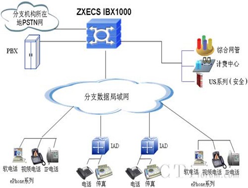 同時在各分支結(jié)構(gòu),可通過中興通訊ZXECS IBX1000綜合媒體網(wǎng)關(guān)提供到各地PSTN的語音落地,實現(xiàn)與各地PSTN的互通。