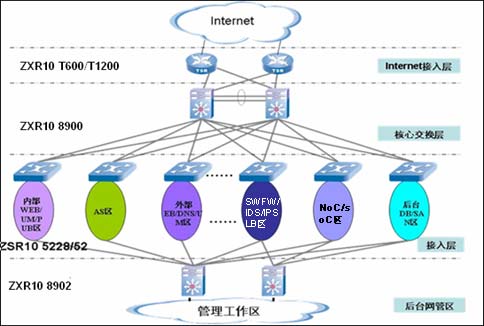 寬帶數據承載網主要考慮的是保證網絡的高可靠性(整體網絡結構全冗余和設備的全冗余配置)、高可擴展性(核心交換設備具有大容量特性和網絡結構的易于拓展)、分層網絡結構和高可用性。中興的解決方案中,整個網絡分成四個部分:Internet接入層、核心交換層、接入層、后臺管理區(qū)。