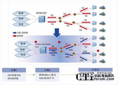 項目選取的試點小區(qū)建設于2006年,原來規(guī)劃的是每用戶6M帶寬。后期小區(qū)實裝率高,實際用戶超過1500戶,IPTV業(yè)務申請量提升后,出現(xiàn)了高峰時段IPTV點播業(yè)務不流暢、同時應用IPTV和上網業(yè)務時網速過慢等問題。而且當湖北電信新推出10M~20M的新寬帶套餐時,該小區(qū)用戶申請新套餐數量受限。該小區(qū)的寬帶接入網絡已經明顯無法滿足用戶日益增長的需求,寬帶提速正當其時。選擇10G EPON,能夠簡單兩步,將小區(qū)接入方式從EPON平滑升級為10G EPON,無需改變網絡結構,只需簡單升級設備(見圖)。
