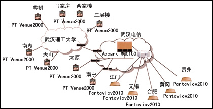武漢理工大學(xué)的遠(yuǎn)程教學(xué)系統(tǒng)由于分2期建設(shè),網(wǎng)絡(luò)條件較為復(fù)雜。一期主要以PT的Venue2000終端+Accord MGC100 MCU為主,是H.323系統(tǒng);二期采用Penteview2010終端+Penteview6088MCU,是H.320系統(tǒng),此案例是國(guó)內(nèi)首家教育行業(yè)H.320與H.323混合組網(wǎng)方式的視頻電視遠(yuǎn)程教學(xué)網(wǎng)。各教室均采用了中太數(shù)據(jù)的遠(yuǎn)程教學(xué)中控系統(tǒng),整個(gè)組網(wǎng)采用星型結(jié)構(gòu),2010和6088之間采用512k的DDN專線連接,其中,384k用于傳輸視頻、音頻,128k用于傳輸T.120數(shù)據(jù)。2010設(shè)備及其標(biāo)準(zhǔn)外設(shè),加上符合遠(yuǎn)程教育功能需要的其他外設(shè),構(gòu)成遠(yuǎn)程教育網(wǎng)絡(luò)專用教室的設(shè)備配置。