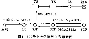 --用戶在撥打800號業(yè)務(wù)用戶號碼時,首先由網(wǎng)絡(luò)點(diǎn)上的普通電話交換機(jī)接收,并把800KN1N2ABCD號碼經(jīng)話路傳送給業(yè)務(wù)交換點(diǎn)SSP,再由SSP將此號碼經(jīng)No.7信令鏈路送到業(yè)務(wù)控制點(diǎn)SCP,SCP通過在業(yè)務(wù)數(shù)據(jù)庫SDP中查尋譯碼表將此號碼翻譯成普通的電話號碼回送SSP,最后由SSP負(fù)責(zé)完成電路的連接,該過程如圖2所示。