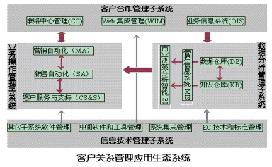 根據(jù)目前IT產(chǎn)業(yè)領(lǐng)域和管理界對(duì)CRM的開(kāi)發(fā)、討論及應(yīng)用的經(jīng)驗(yàn)和反饋,綜合來(lái)講,一個(gè)完整的客戶關(guān)系管理應(yīng)用系統(tǒng)由如下四大生態(tài)子系統(tǒng)組成:
