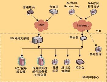 NBX網(wǎng)絡(luò)呼叫中心的核心是3Com公司的NBX網(wǎng)絡(luò)電話交換機(jī),它具有PBX的功能,支持多種外線接入方式,呼入的語音信號轉(zhuǎn)換為數(shù)據(jù)包,在局域網(wǎng)內(nèi)部傳輸,實(shí)現(xiàn)局域網(wǎng)內(nèi)部語音、數(shù)據(jù)的統(tǒng)一。坐席可以延伸到數(shù)據(jù)網(wǎng)可以達(dá)到的地方(適當(dāng)?shù)膸挘,而不受地理位置的限制。你可以通過申請各類專線,如VPN、DDN等,將計(jì)算機(jī)連入呼叫中心,實(shí)現(xiàn)分地域、分種類、分?jǐn)?shù)據(jù)的服務(wù)。NBX網(wǎng)絡(luò)呼叫中心擴(kuò)大了對外服務(wù)方式,通過上網(wǎng)訪問企業(yè)主頁,并使用Windows集成的Netmeeting軟件通過使用電腦的聲卡、耳機(jī)、麥克風(fēng)直接與服務(wù)代理人員進(jìn)行語音交流。