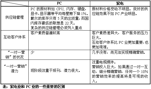 聯(lián)想長(zhǎng)期構(gòu)筑的、在中國(guó)PC制造業(yè)的核心競(jìng)爭(zhēng)力,正受到戴爾的巨大威脅,導(dǎo)致聯(lián)想開(kāi)始轉(zhuǎn)而采用戴爾的按客戶需求定制、直接銷售的模式,希望建立新的核心競(jìng)爭(zhēng)力,再度引領(lǐng)中國(guó)PC產(chǎn)業(yè)。IT制造業(yè)的巨變,戴爾的成功給陷于低層次競(jìng)爭(zhēng)的家電產(chǎn)業(yè)很大的啟發(fā),曾經(jīng)鑄造中國(guó)家電企業(yè)輝煌的核心競(jìng)爭(zhēng)力急需注入新的生命力,以適應(yīng)新的競(jìng)爭(zhēng)形勢(shì)。計(jì)算機(jī)技術(shù)、互動(dòng)通信技術(shù)的進(jìn)步以及互聯(lián)網(wǎng)的出現(xiàn)使企業(yè)能夠建立與用戶之間一對(duì)一的密切客戶關(guān)系,使服務(wù)創(chuàng)造價(jià)值,IT技術(shù)推動(dòng)技術(shù)、產(chǎn)品、生產(chǎn)、銷售和營(yíng)銷的發(fā)展,支撐家電企業(yè)建立新的核心競(jìng)爭(zhēng)力。在同質(zhì)化競(jìng)爭(zhēng)的環(huán)境下,家電企業(yè)也許更應(yīng)該從服務(wù)、營(yíng)銷、銷售方面來(lái)建立自己的核心競(jìng)爭(zhēng)力。海爾就是典型的例子,海爾的發(fā)展與它完善的服務(wù)體系和服務(wù)制度是分不開(kāi)的。聚焦于服務(wù)、營(yíng)銷、銷售的客戶關(guān)系管理(CRM)系統(tǒng)讓家電企業(yè)看到了新的希望?梢灶A(yù)言,CRM將為家電業(yè)點(diǎn)燃一盞新啟航燈。
