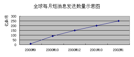 。。2001年全球的短消息服務(wù)業(yè)得到了迅猛的發(fā)展,全球共發(fā)送短消息2000億條。在中國短消息服務(wù)市場中,中國移動在2001年發(fā)送短消息159億條,中國聯(lián)通發(fā)送短消息30億條。隨著中國移動和中國聯(lián)通之間的互聯(lián)互通,中國短消息市場在2002年將達(dá)到300億條。并且中國電信和中國網(wǎng)通也加入到此市場中,中國固話短消息也將在此市場中占有一席之地。 中國的移動用戶在2002年4月已經(jīng)到了1.6億戶,并且還在以500萬戶/月的速度發(fā)展,估計到2005年中國的移動用戶將達(dá)到4.5億戶,中國手機用戶在35歲以下的占80%左右,他們是使用短消息的主體人群,因此中國移動短消息具有非常大的發(fā)展?jié)摿Α?/p>