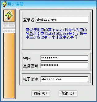 DICO下載后的安裝過程比較簡單: "接收協(xié)議"后一路"下一步"就OK了。然后是注冊,過程也委簡單:運(yùn)行后,第一次使用時點(diǎn)"注冊"(以后使用時只要輸入用戶名或密碼登錄就是了),隨后的"用戶注冊"窗口中填寫好相關(guān)的選項(xiàng)后點(diǎn)"確定"(下圖2)就OK了!
