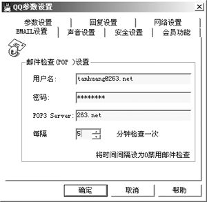 IM和E-mail是我們在網(wǎng)上最常用的兩種工具,如今不少IM軟件將兩者作了完美的結(jié)合。在QQ中你可以直接給自己的好友發(fā)郵件,而無須再輸入E-mail地址;此外對于自己的信箱QQ還有檢查新郵件功能,在“系統(tǒng)參數(shù)”中設置您自己的E-mail,填好POP3地址,您可以選擇定時檢查時間,QQ就會自動檢查有否新郵件到達。對于MSN