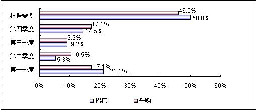 賽迪顧問針對視頻會議終端系統(tǒng)用戶招標(biāo)與采購的調(diào)查表明,用戶招標(biāo)與采購的季節(jié)性差異比較明顯,除了將近50%的用戶會根據(jù)需要在不確定的時間里進行招標(biāo)和采購以外,第一季度和第四季度成為用戶招標(biāo)和采購相對集中的時間段,這與許多其他商用IT產(chǎn)品的采購類似。具體到招標(biāo)和采購的月份,10月份成為最為集中的時間。原因在于,視頻會議終端系統(tǒng)的采購受行業(yè)用戶的資金規(guī)劃與使用的影響顯著。第一季度往往是各企事業(yè)單位資金充裕的時期,到了第四季度又是政府部門為完成本年度信息化建設(shè)的任務(wù),往往產(chǎn)生比較集中的設(shè)備采購。
