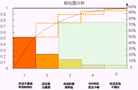 通過匯總的數(shù)據(jù)進(jìn)行分析,他們發(fā)現(xiàn)客戶不滿意的原因很多,于是選取了最大的五個(gè)原因, 用"柏拉圖"做了分析,同時(shí),對(duì)于這最重要的五個(gè)原因又作了一次頭腦風(fēng)暴和"魚骨圖分析"。
