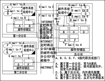 · F mail to A:F發(fā)郵件給A,此郵件經(jīng)由Internet發(fā)到總公司A的信箱中,因?yàn)橛蛎潜唤忉尩娇偣镜姆⻊?wù)器上,第一分公司的服務(wù)器會定時將總公司A信箱中的郵件取回,所以對A來講,F(xiàn)發(fā)來的郵件就好像是直接遞送到本公司的服務(wù)器上一樣。