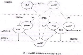 在移動通信領(lǐng)域,歐洲電信標準學會(ETSI)制定的CAMEL系列標準為基于GSM移動通信網(wǎng)絡(luò)的移動智能網(wǎng)提供了統(tǒng)一的規(guī)范。其中CAMEL2階段的標準符合ITU-T的IN CS-1,支持各種基于語音的智能業(yè)務(wù)。CAMEL2階段移動智能網(wǎng)的功能體系結(jié)構(gòu)如圖1所示。CAMEL3階段的標準基于CS-2,主要增加了對GPRS移動數(shù)據(jù)業(yè)務(wù)以及短消息業(yè)務(wù)的支持。