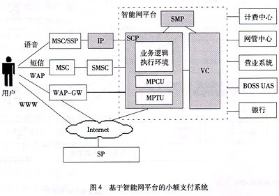 鑒于以上原因,目前中國移動正在建設(shè)的全國范圍的小額支付系統(tǒng)已確定采用基于智能網(wǎng)平臺的建設(shè)方式;谥悄芫W(wǎng)平臺的小額支付系統(tǒng)如圖4所示。