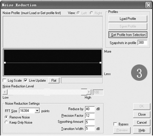 from Selection按鈕,程序會讀入噪音樣本,之后關(guān)閉該對話框回到主界面,單擊噪音樣本音軌,按Delete刪除它,再雙擊另外一個(gè)波音音軌,進(jìn)入波音編輯器界面再雙擊,全選之后按照上面的操作再次打開Noise