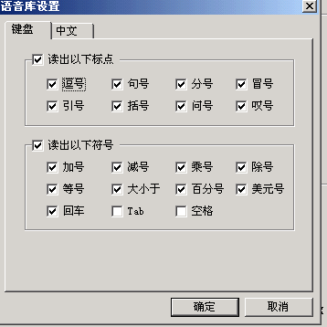 如果需要進(jìn)一步的調(diào)整,可以選擇菜單里的“設(shè)置……”。打開(kāi)設(shè)置窗口(如圖3)。窗口共分四個(gè)選項(xiàng),每個(gè)選項(xiàng)里除了剛介紹的幾種常用功能調(diào)整外,還可以控制歡迎畫(huà)面、開(kāi)始畫(huà)面、設(shè)定存儲(chǔ)等功能,規(guī)定提示速度、朗讀速度的快慢,選擇提示方式,設(shè)定提示報(bào)警條件。在“語(yǔ)音庫(kù)”選項(xiàng)中還可以選擇朗讀為男聲還是女聲。單擊“設(shè)置”按鈕,可以根據(jù)具體需要選擇“鍵盤(pán)”或“中文”里被朗讀標(biāo)點(diǎn)符號(hào)的種類(如圖4)。