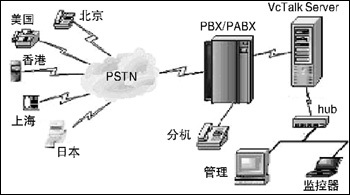 用語音板卡搭建電話會議一般注重在單一的音頻通信?紤]到單純的音頻或視頻會議模式都或多或少有各自的局限性,宇音將數(shù)據(jù)與語音整合在一起,實現(xiàn)音頻/圖文會議。VCTalk各系列電話會議系統(tǒng)采用高性能的語音/會議資源卡作為硬件支持,可實現(xiàn)多方電話會議(≥8),具有多組會議、與會者身份認(rèn)證、設(shè)置會議主持人、邀請與會者、會議通知、會議內(nèi)容同步播放、會議密碼保護(hù)、智能播放、會議內(nèi)容全程錄音/存儲、本地/遠(yuǎn)程查聽會議錄音的功能,并可以對企業(yè)內(nèi)部發(fā)生的呼叫記錄進(jìn)行計費和統(tǒng)計。針對中小企業(yè)辦公靈活的特點,VCTalk系統(tǒng)搭建簡單易行,其結(jié)構(gòu)圖見圖1。