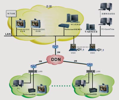 在上述網(wǎng)絡(luò)結(jié)構(gòu)中,還可以方便地繼續(xù)發(fā)展第三級視頻會議子網(wǎng)。正如前面提到的,這個第三級子網(wǎng)中,完全可以使用普通視頻會議終端,以節(jié)約大量費用。