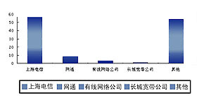 在國內(nèi),視訊市場的形成已經(jīng)初露端倪,眾多商家都開始瞄準(zhǔn)這個(gè)新的利潤增長點(diǎn)。2002年8月,上海電信正式將視訊業(yè)務(wù)命名為“新視通”,并陸續(xù)開通了上海至美國洛杉磯、新疆烏魯木齊、石河子、克拉瑪依等地區(qū)的公眾視訊業(yè)務(wù),同時(shí)還針對商用客戶和個(gè)人用戶啟動(dòng)了推廣計(jì)劃。由于上海是我國的貿(mào)易、金融、經(jīng)濟(jì)中心,許多國內(nèi)外的大型企業(yè)都在上海設(shè)有分支機(jī)構(gòu),市場潛力不可估量,眾多運(yùn)營商都在爭取上海的市場。目前,除了上海電信推出的“新視通”業(yè)務(wù)外,網(wǎng)通、有線網(wǎng)絡(luò)和其它公司都在上海推出了自己的視訊系統(tǒng)。根據(jù)我們對企業(yè)用戶的抽樣調(diào)查,下圖的市場占有率表明了視訊業(yè)務(wù)的競爭將會(huì)日益激烈。