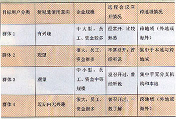 根據(jù)前一階段我們做的視訊業(yè)務(wù)市場研究,目前的主要目標(biāo)客戶可以定位為以下范圍:對于“新視通”會(huì)議系統(tǒng)感興趣的客戶,需要觀望的客戶以及雖然不感興趣但企業(yè)規(guī)模較大、存在著一定會(huì)議需求卻對遠(yuǎn)程會(huì)議不了解的客戶。通過對目標(biāo)群體的進(jìn)一步細(xì)分,我們將客戶聚類為四個(gè)主要群體: