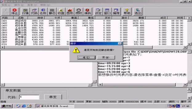 選擇該功能,系統(tǒng)會(huì)自動(dòng)發(fā)送所有指數(shù)和股票的歷史圖形。歷史圖形發(fā)送用時(shí)較長(zhǎng),一般要用一個(gè)小時(shí)左右,它中間的延時(shí)要由信息發(fā)布時(shí)間間隔來定,信息發(fā)布時(shí)間間隔越大,耗時(shí)越長(zhǎng)。