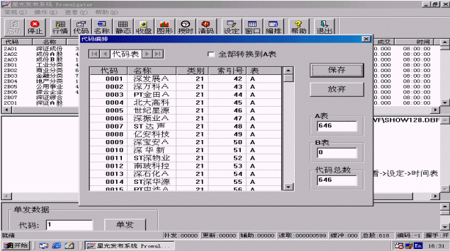 代碼編排是指用戶根據(jù)證券數(shù)據(jù)記錄在數(shù)據(jù)庫(kù)中的位置重新排定股票的索引位置,索引次序可不同于證券代碼的次序,也不是數(shù)據(jù)庫(kù)中記錄的次序,用戶可根據(jù)需要自己設(shè)定,將來發(fā)布信息時(shí)就按此索引次序(索引號(hào))所指向的股票信息位置取信息進(jìn)行發(fā)布。