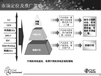 為了打開網(wǎng)通視訊業(yè)務(wù)的局面,網(wǎng)通的推廣方案也非常完備,這位負責(zé)人向記者出示了一張圖(見左下圖),詳細地解釋了網(wǎng)通視訊業(yè)務(wù)的市場定位及推廣策略。首先是通過媒體宣傳給客戶以整體印象,力求覆蓋面廣,眾所周知; 接著以直郵形式有針對性地發(fā)放詳細單頁資料,深入宣傳;然后以小型研討會、技術(shù)講座等形式,有針對性地召集當(dāng)?shù)啬繕丝蛻?潛在用戶,細論VC市場及產(chǎn)品; 最后是以巡展、樣板客戶案例造聲勢,提高產(chǎn)品形象。