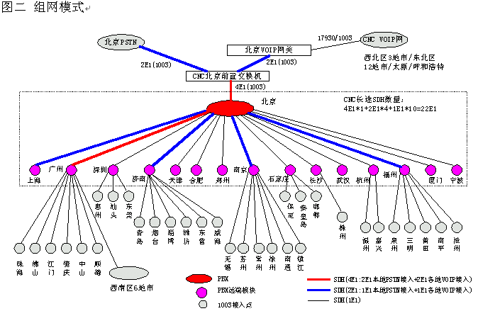 網(wǎng)通的客戶服務(wù)系統(tǒng)(1003呼叫中心)包括位于北京總部的總中心及其它全國30多個(gè)城市的分中心,全國范圍共有近200個(gè)接入點(diǎn)(覆蓋城市),共有200余座席,由總中心,交換機(jī)遠(yuǎn)端模塊接入點(diǎn)子中心及軟覆蓋接入點(diǎn)組成的三層架構(gòu)。參見下圖一《系統(tǒng)架構(gòu)》及圖二《組網(wǎng)模式》。