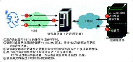 由于電話(包括很多蜂窩電話)沒(méi)有計(jì)算功能,無(wú)法管理語(yǔ)音瀏覽器,所以語(yǔ)音瀏覽器駐留在網(wǎng)絡(luò)上的語(yǔ)音服務(wù)器中。語(yǔ)音服務(wù)器可以位于企業(yè)數(shù)據(jù)中心,或者位于主管供應(yīng)商處。用戶撥叫一臺(tái)語(yǔ)音服務(wù)器,該服務(wù)器從一臺(tái)應(yīng)用服務(wù)器上下載VoiceXML 2.0腳本、語(yǔ)法格式和聲音文件。語(yǔ)音瀏覽器以一種語(yǔ)音信息的形式將VoiceXML 2.0腳本翻譯給用戶聽(tīng),語(yǔ)音信息可以是預(yù)先錄制的語(yǔ)音,或經(jīng)由一個(gè)文本語(yǔ)音合成器產(chǎn)生的文本。然后語(yǔ)音瀏覽器調(diào)用一個(gè)自動(dòng)語(yǔ)音識(shí)別(ASR)軟件,使用語(yǔ)法格式來(lái)識(shí)別出用戶響應(yīng)的語(yǔ)音詞匯。
