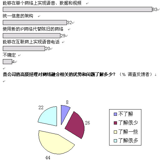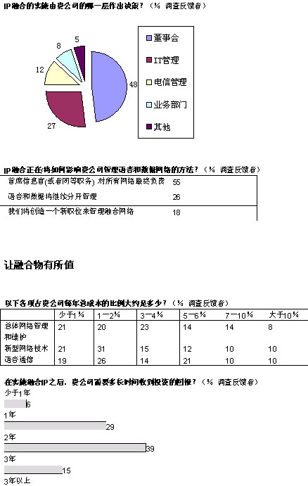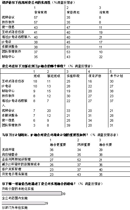融合網絡已經成為現實。在經濟學家信息部展開的全球調查中,103位高級經理中超過半數的人投票表示,他們的企業(yè)已經開始實施IP網絡融合,還有26%表示他們將計劃部署。