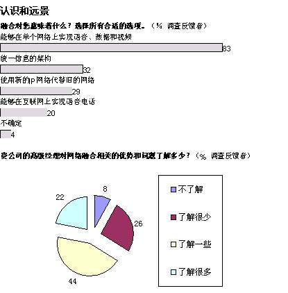 無論他們對融合網絡的優(yōu)勢是否有一個詳細的認識,在大多數管理人員看來:融合無疑會在未來五年內對他們的企業(yè)產生重要的影響。引人注目的是,24%的人認為融合對實現組織的戰(zhàn)略商業(yè)目標是“必不可少”的,38%的人認為是非常重要的。極少人認為融合網絡不甚重要。