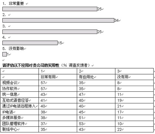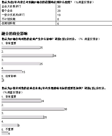 我們調查的企業(yè)中,有超過三分之二將在未來五年內實現大多數或者所有部門向融合網絡的轉型。大部分企業(yè)采取按部就班的形式在某些特殊部門和業(yè)務開始部署。在融合應用中,IP語音電話將在未來三年內吸引大量投資;管理人士期望通過大幅削減公司內部的通話費用獲得早期的回報。在更廣泛的層面上,大多數管理者預計,融合網絡對其企業(yè)的商業(yè)影響將會“非常重要”或者“重要”。