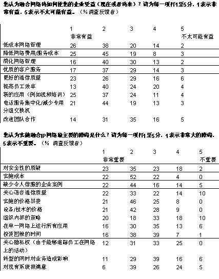 不久以前,“融合”這個詞給人的感覺是過分追捧技術和超前于時代的概念。此后不久,傳輸數據、語音和視頻的網絡融合逐漸成為現實。根據對103位高級經理的調查結果表明,三分之二的企業(yè)正計劃在今后五年內將其覆蓋整個企業(yè)的應用轉型為統(tǒng)一的IP網絡。四分之一的調查反饋者認為這對實現其企業(yè)戰(zhàn)略“尤為重要”。