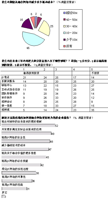 盡管如此,雖然IP融合的真正長期效益可能有利于提高員工效率,但是投資必須得到公司首席財務官的認可。在總體網絡成本中預計可以節(jié)約多少?大多數公司希望削減10%-20%的費用,也有相當一部分公司期望減少30%-40%的費用。上述報告中提到的實例中表明,這樣的節(jié)約是可以實現的。