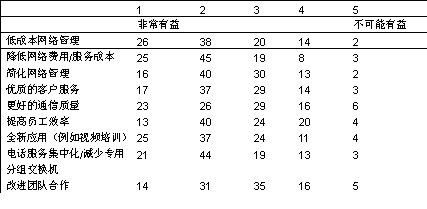 您認為融合網絡將怎樣使您的企業(yè)受益(現在或者將來)?請為每一項打1至5分,1表示非常有益,5表示不可能有益。(% 調查反饋者)
