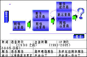 Switch(軟交換)、3G、IPv6等技術(shù)進(jìn)行系統(tǒng)構(gòu)筑,全面融合先進(jìn)的語(yǔ)音、數(shù)據(jù)及移動(dòng)通信IP一體化解決方案,從而為企業(yè)提供不同需求層次的選擇。另外,由此導(dǎo)致產(chǎn)業(yè)結(jié)構(gòu)也悄悄地發(fā)生變化,產(chǎn)業(yè)朝三層級(jí)和多層級(jí)演變通信的新結(jié)構(gòu)和新角色:服務(wù)運(yùn)營(yíng)商的誕生,網(wǎng)絡(luò)運(yùn)營(yíng)商向服務(wù)提供商的轉(zhuǎn)型。