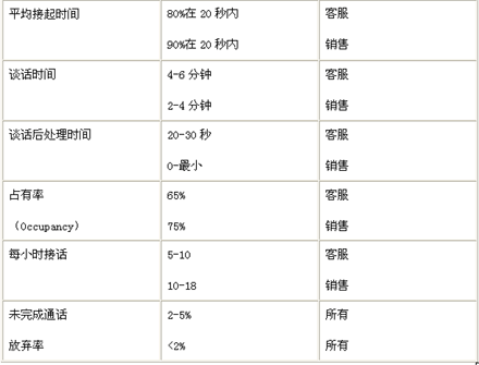 呼叫中心管理需要大量的量化指標。這些指標應(yīng)當參照別人的經(jīng)驗,但絕對沒有拿來就用的“基本標準”。常用的有以下一些: