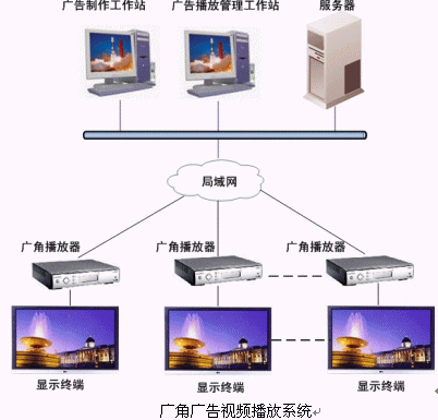 廣角廣告視頻播放系統(tǒng)由播放管理工作站、廣角播放器、網(wǎng)絡(luò)平臺(tái)和顯示設(shè)備(如液晶電視)組成。