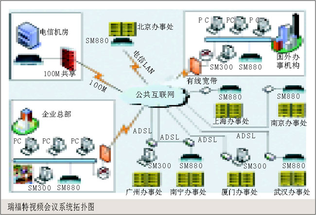 。。本系統(tǒng)中包含多個(gè)會場,使用瑞福特SM 880硬件終端,每個(gè)會場采用單獨(dú)的ADSL接入(也可采用其他接入方式),能夠保證發(fā)送與接收320×240、25