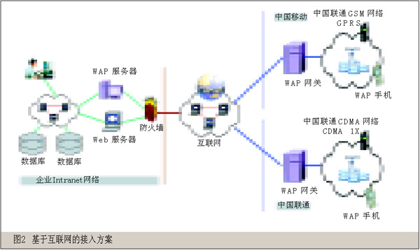如圖2所示,本方案適用于已經(jīng)有基于互聯(lián)網(wǎng)架構(gòu)Web應(yīng)用部署的中小型企業(yè),企業(yè)只需在安裝Web服務(wù)器的位置再設(shè)置一臺WAP服務(wù)器即可(為了節(jié)約成本,WAP服務(wù)器甚至可以直接部署在Web服務(wù)器上),并不需要改變現(xiàn)有網(wǎng)絡(luò)的拓?fù)浣Y(jié)構(gòu),也不用關(guān)心用戶的連接方式,企業(yè)并不參與中國移動(中國聯(lián)通)內(nèi)部數(shù)據(jù)網(wǎng)絡(luò)與互聯(lián)網(wǎng)的網(wǎng)絡(luò)聯(lián)接,具有投資省、部署快、易維護(hù)的特點(diǎn)。網(wǎng)絡(luò)安全性依賴于與互聯(lián)網(wǎng)相連的防火墻的可靠性,安全性能中等。
