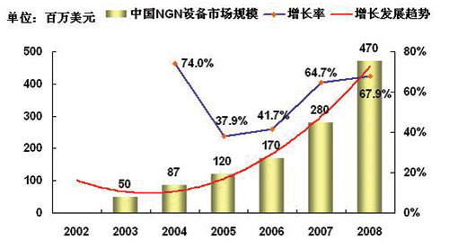 對(duì)于中國NGN市場(chǎng)規(guī)模的預(yù)測(cè),主要取決于各個(gè)運(yùn)營商在NGN方面的戰(zhàn)略發(fā)展重點(diǎn),以及重點(diǎn)的投資方向?傮w上來說,從2003年起,以IPTV、VOIP、寬帶接入等業(yè)務(wù)為代表的NGN的部分業(yè)務(wù)的推廣,使得事實(shí)上中國已經(jīng)形成一定的NGN的市場(chǎng)規(guī)模,盡管這一市場(chǎng)規(guī)模仍然很小。2004年中國的NGN基礎(chǔ)設(shè)備的市場(chǎng)規(guī)模超過8千萬美元,以后隨著各個(gè)運(yùn)營商N(yùn)GN戰(zhàn)略的進(jìn)一步清晰,這一部分的投資會(huì)保持持續(xù)穩(wěn)定的增長,2005~2008年以后的NGN設(shè)備投資規(guī)模的平均增長率可以達(dá)到50%。