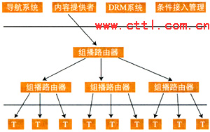 IPTV業(yè)務(wù)提供者可以根據(jù)用戶的請(qǐng)求,利用IP網(wǎng)絡(luò)本身所提供的組播能力將視頻信息以組播的方式傳送給用戶。此時(shí),同時(shí)向相同的業(yè)務(wù)提供者請(qǐng)求發(fā)送相同內(nèi)容信息的用戶,可以由業(yè)務(wù)提供者安排在同一個(gè)組播組中接收到相同的信息。為給內(nèi)容提供者提供知識(shí)產(chǎn)權(quán)保護(hù),業(yè)務(wù)提供者提供條件接入控制。同時(shí)為減少骨干網(wǎng)絡(luò)傳輸?shù)膲毫,業(yè)務(wù)提供者在向眾多的用戶提供組播式業(yè)務(wù)時(shí)可以利用多級(jí)組播的形式來實(shí)現(xiàn)。組播式IPTV業(yè)務(wù)可能的系統(tǒng)模型示意如圖1所示。