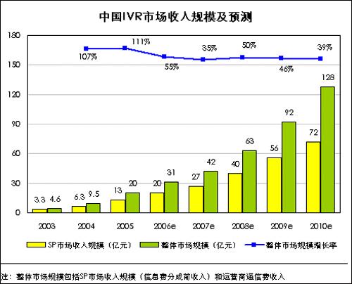 iResearch通過研究分析,2005年中國IVR市場總體收入規(guī)模(包括通信費(fèi)及信息費(fèi))為20億元,2006年將達(dá)到31億元,預(yù)計(jì)到2010年將達(dá)到128億元,市場增長率將呈現(xiàn)逐步下降的趨勢。其中IVR市場中SP的收入規(guī)模在2005年為13億元,2006年將達(dá)到20億元。