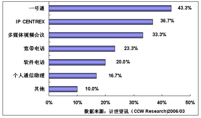 通過計世資訊(CCW Research)的調(diào)研可以看到,行業(yè)用戶對一號通、IP-CENTREX、多媒體視頻會議和寬帶電話等基于NGN平臺開發(fā)的業(yè)務比較感興趣,其中:對一號通感興趣的用戶達到43.3%,對IP-CENTREX感興趣的用戶為36.7%,對多媒體視頻會議感興趣的用戶達到33.3%,對寬帶電話感興趣的用戶達到23.3%,對軟件電話感興趣的用戶達到20.0%,對個人通信助理感興趣的用戶達到16.7%。