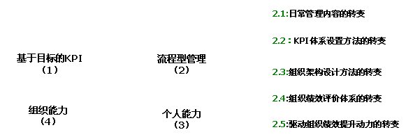 如圖1中的第(1)部分所示,客戶服務(wù)中心原來的管理是基于目標(biāo)KPI的管理,為了有效實施“流程型”管理,必須將其轉(zhuǎn)變“流程型”管理的組織,即必須將原來基于目標(biāo)的KPI管理轉(zhuǎn)變?yōu)榛诹鞒痰腒PI管理和流程(過程)管理(如圖1中的第(2)部分所示)。同時,通過對員工培訓(xùn)組織所具有的一流的流程,使員工按照流程能力產(chǎn)生一流的績效,實現(xiàn)組織向員工的能力傳遞,有效提高每個員工的個體能力(如圖1中的第(3)部分所示);通過統(tǒng)一規(guī)范的流程保證個體行為的一致性,從而保證組織的能力,從而推動整個團(tuán)隊組織能力的提升(如圖1中的第(4)部分所示),最終通過組織能力保證組織目標(biāo)績效的實現(xiàn)(如圖1中的第(1)部分所示)。