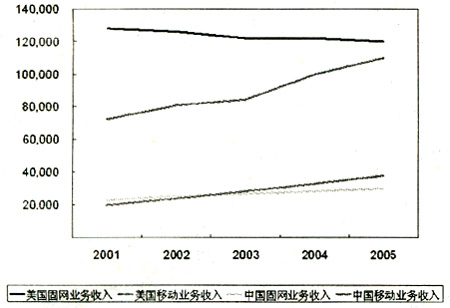 美國(guó)與中國(guó)固網(wǎng)與移動(dòng)業(yè)務(wù)收入比較(單位:百萬美元)